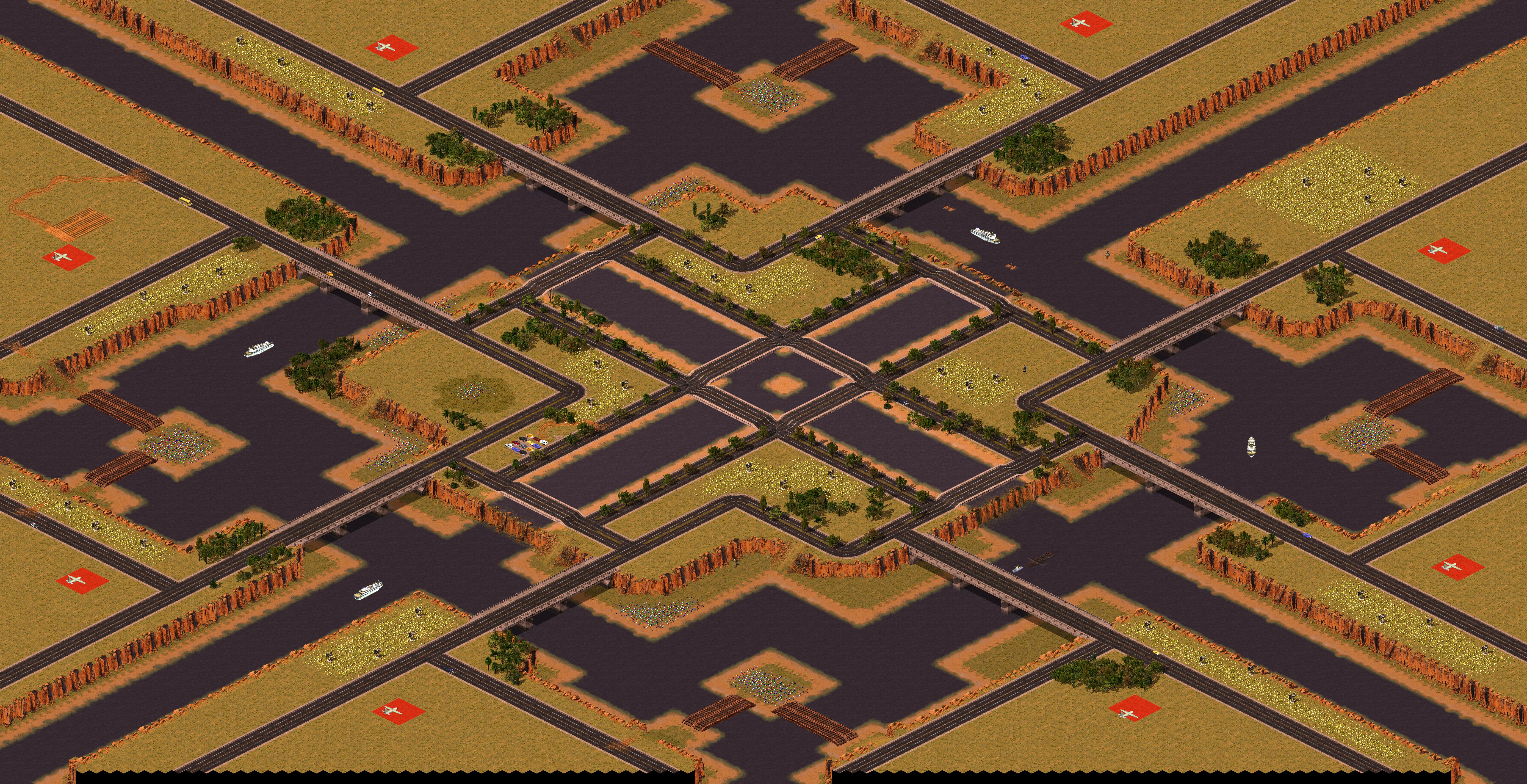 Description: Probably the best map i've made, lots of tactical advantages on this. A city in the middle to trap your enemy in their base, bridges connecting to the middle via each base, aswell as lil' tech islands which you can get by bridges (2 bases per text island, 3 techs per island). Build your Airforce, Naval fleet or Ground army, all will work well on this map.