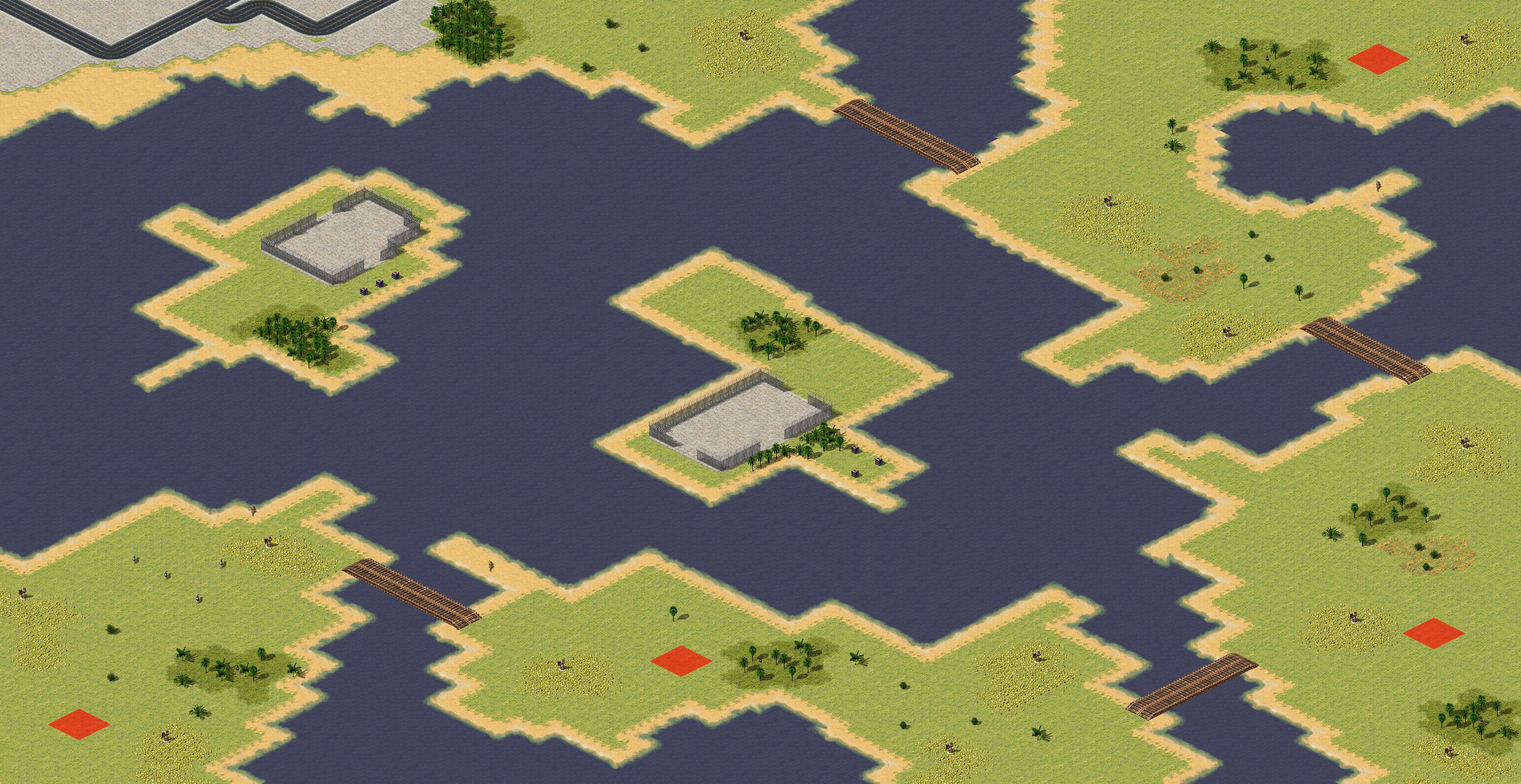 Battle Cove: This is a medium map for up to 4 people, interesting for naval battles, with the bases on continents and a small civilian town in the north. Continents are connected by bridges, and there are islands with buildings in the middle.