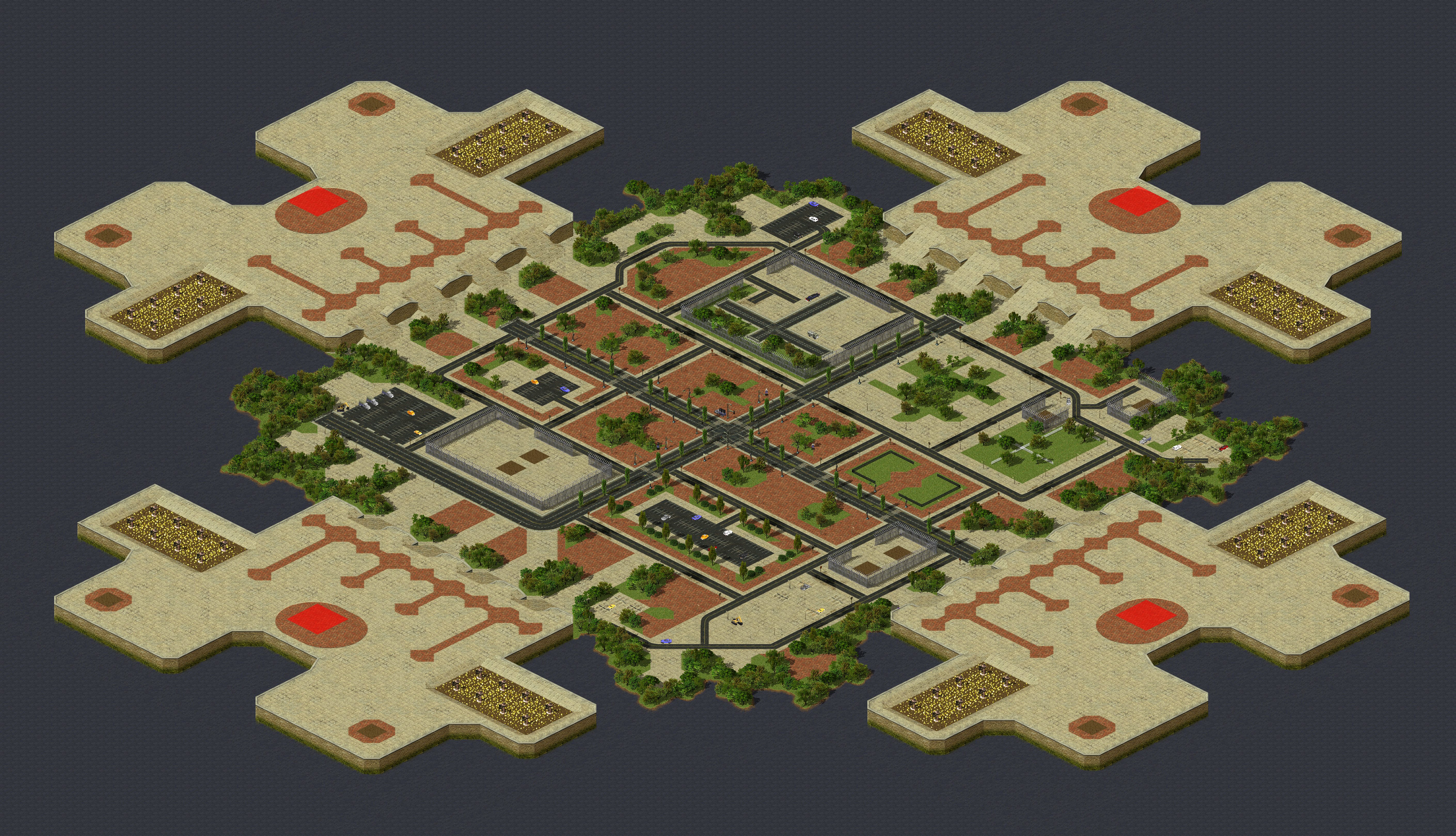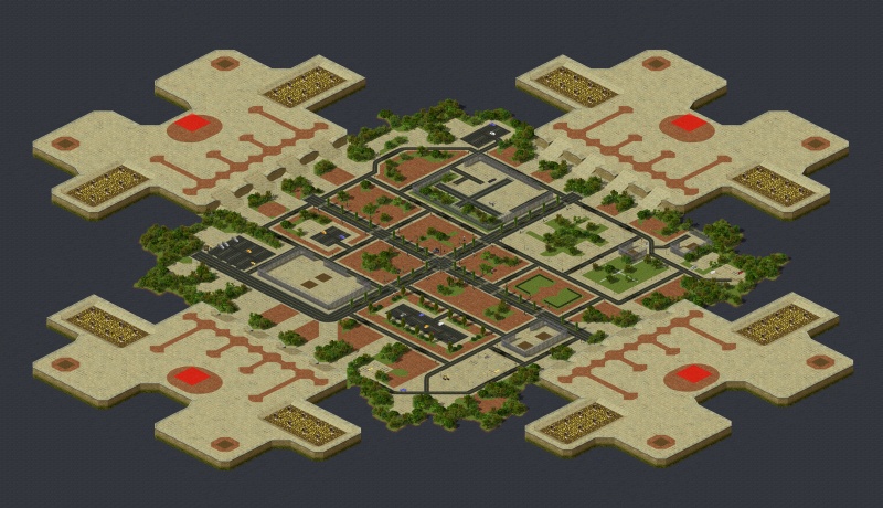 Tips: Garrison ALL your bunkers and capture your 2 'home' oil derricks immediately. The bunkers will tend to draw fire from many of the Civilian attacks. While the Civ units are busy with your bunkers, quick-response backup units can wipe them out. Use caution when moving through the city. If playing against other human players, be opportunistic. When the Civs attack your opponent, move in and strike. Take out his bunkers to blind him, while keeping your own bunkers in good repair. If playing in Skirmish mode, Free-For-All will be very easy since the Civ units will do much of the work of defeating the AI enemies for you. For this reason, FFA should be played for amusement value only. In Battle mode, newbie players may find this map too difficult since all the Civ attacks (except for the Nuke and Storm strikes) will be aimed at the player.