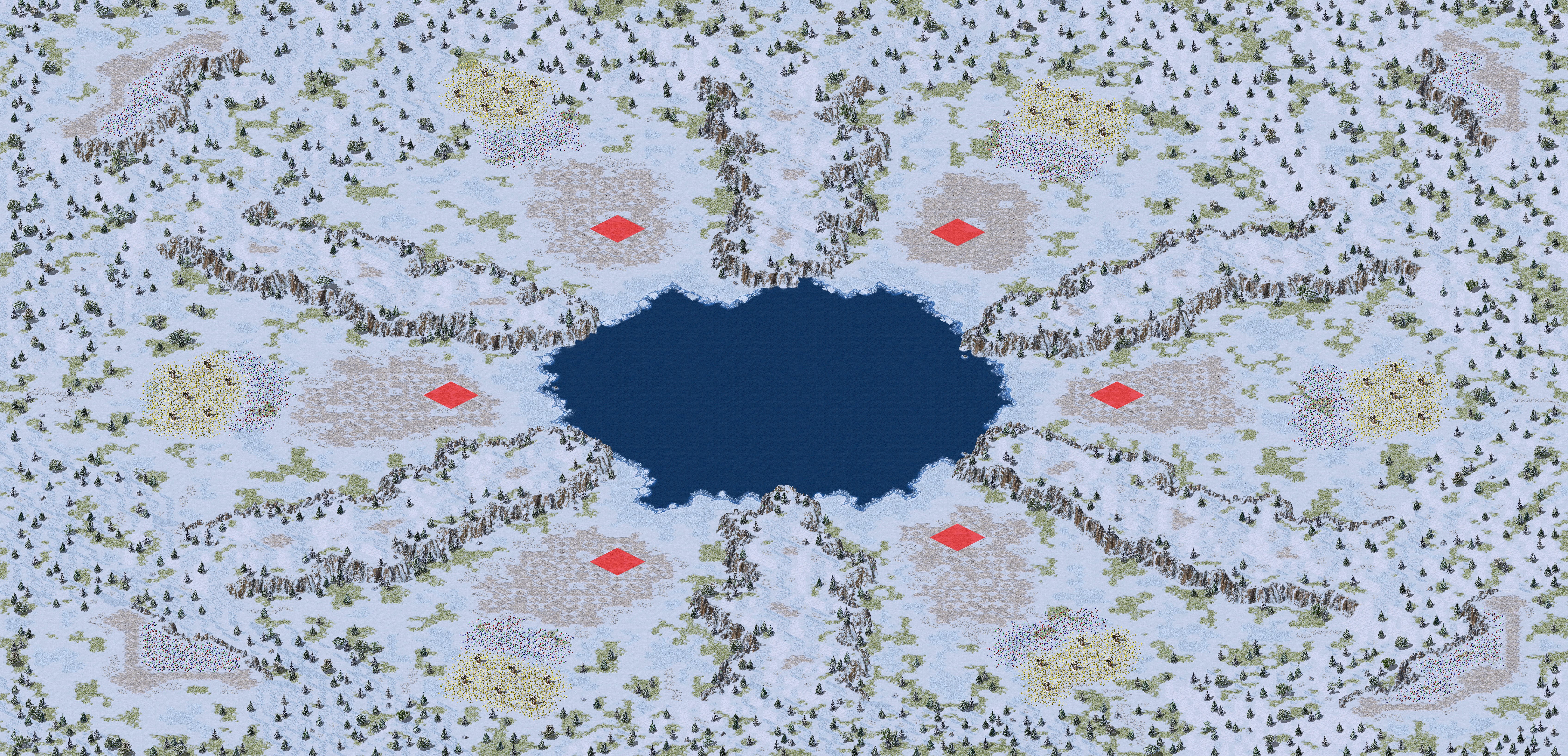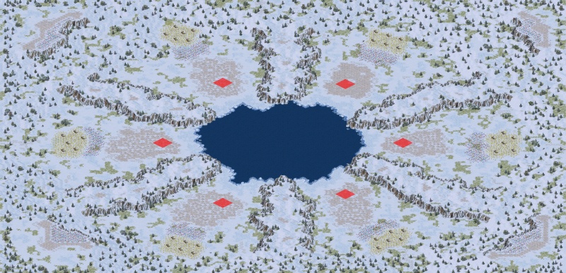 Designed for fast-paced 6-way battle. The bases are placed close to each other, with cliffs separating them. The small body of water in the center ensures that naval vessels can strike any base within moments after being built. An airport can be found in the mountains in each corner. There's not enough room for everyone to maintain a navy, and not enough airports to go around... so don't get frozen out!