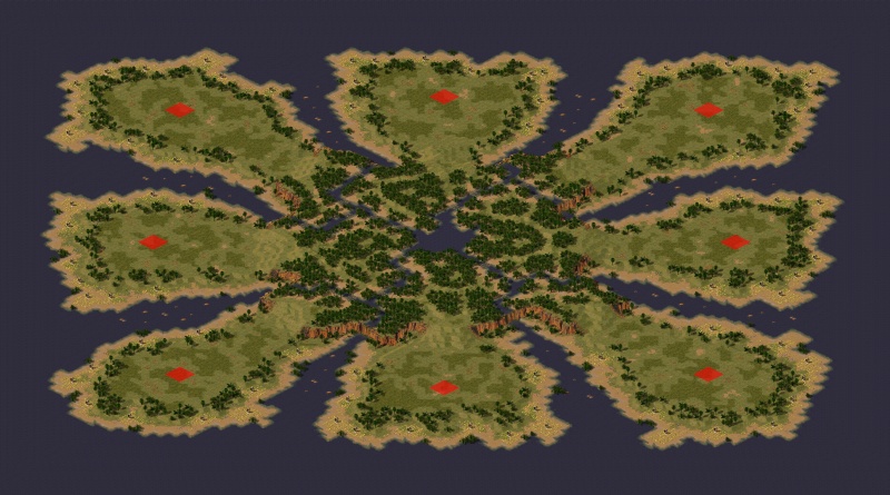 *Description: The existence of one of Einstein's peacetime research facilities, abandoned at the start of the war, has just come to light. The different factions are scrambling to capture this facility, which has fallen into disrepair, in the hope of discovering new technology they can use in their ongoing conflict. The setting is a large island with 8 peninsulas, which features 8 fair starting positions, and also allows for 8-way naval battles. At the center of the island, there are 4 Tech Airports (which give special ParaDrops that include SEALs), and there are 4 instances of a 'new' Tech building - Einstein's Lab. Capture it with an engineer, and you'll be able to train SEALs. A few other minor mods are included as well, but this map should work fine when played under other mods (like Aftermath).