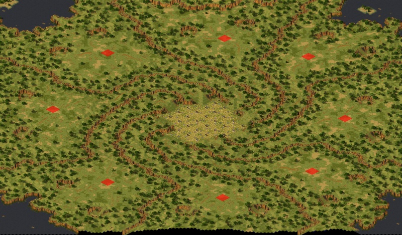 The interlocking cliffwork was done entirely in framework mode. Cliffs surrounding the oil derricks and water cliffs at the map corners, were placed on top of already-raised terrain, then lowered as a unit ('Lower terrain tool' while holding the CTRL key). This technique works on water too, don't let anyone tell you that you can't raise/lower water. The uneven terrain was roughed out with the 'raise/lower terrain' tools, and fine detail was applied using the individual ramp tiles, adjusting with the 'raise/lower single field' tools where appropriate.