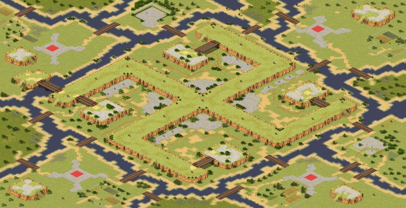 Features: This map has many choke points and defendable locations. The terrain offers many unique areas to expand and control vital bridges. The map is fairly symetrical, but each starting location offers a slightly different strategy. There are a few goodies scattered around.