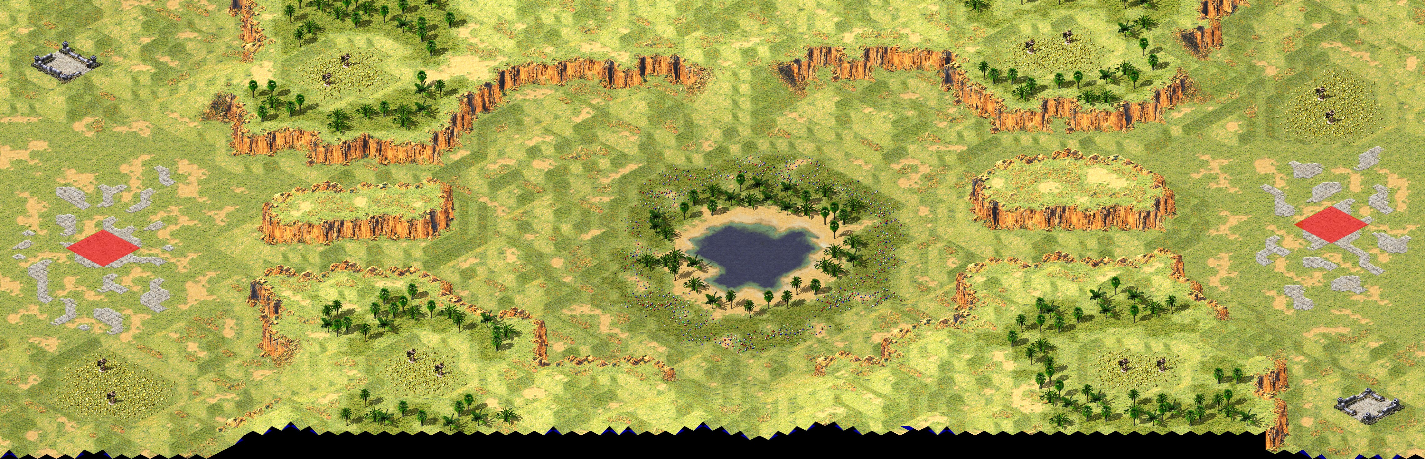 Oasis is a small desert theatre map and is very small. It's a soviet map and is ment for fast games. Each player starts with an ore field nearby and fpr each 2 extra ore fields on the nearby cliffs. In the middle, there are gems for on long run. The one who gets those first is normally winner. Now: getting and securing them is not easy. You need to basewalk exact over the cliffs to reach it and gettying an ore refinery right next to it (pictures are included to give you an idea about it).