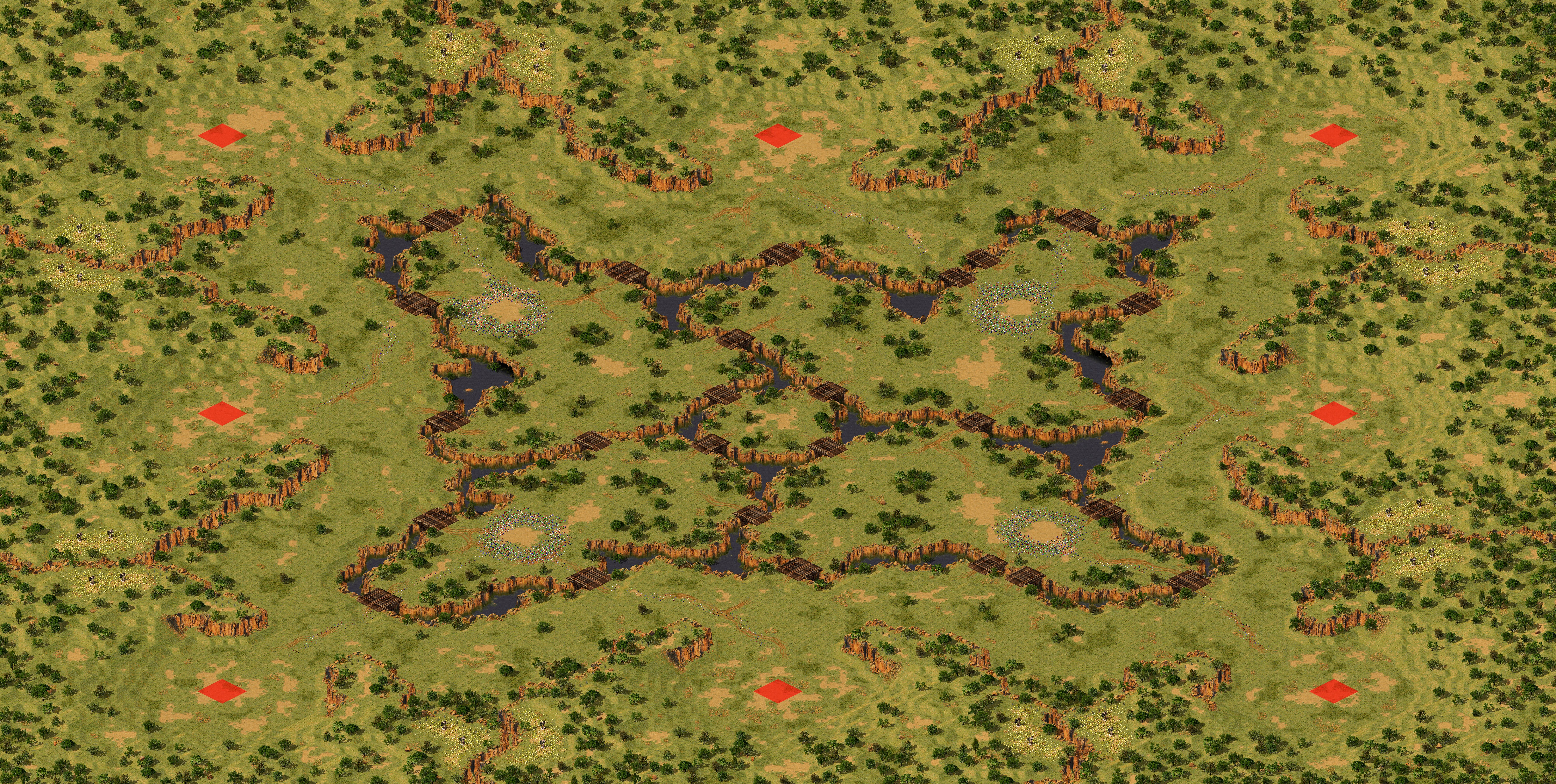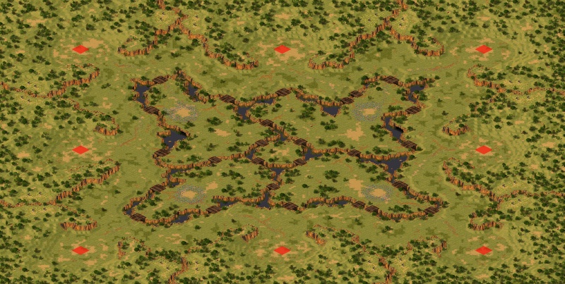 After going a little nuts with triggers and teams in my last map, 'City Fights Back', I decided to return to the basics of what this game is about: strategy and resource management. No Civilian units anywhere, and only 3 sound triggers, that's it. Also I wanted to apply some of the terrain style I used in OverExtended, and the interlocking cliffwork I used in Inversion, to a b-i-i-g 8-player map... the result is what you see here.