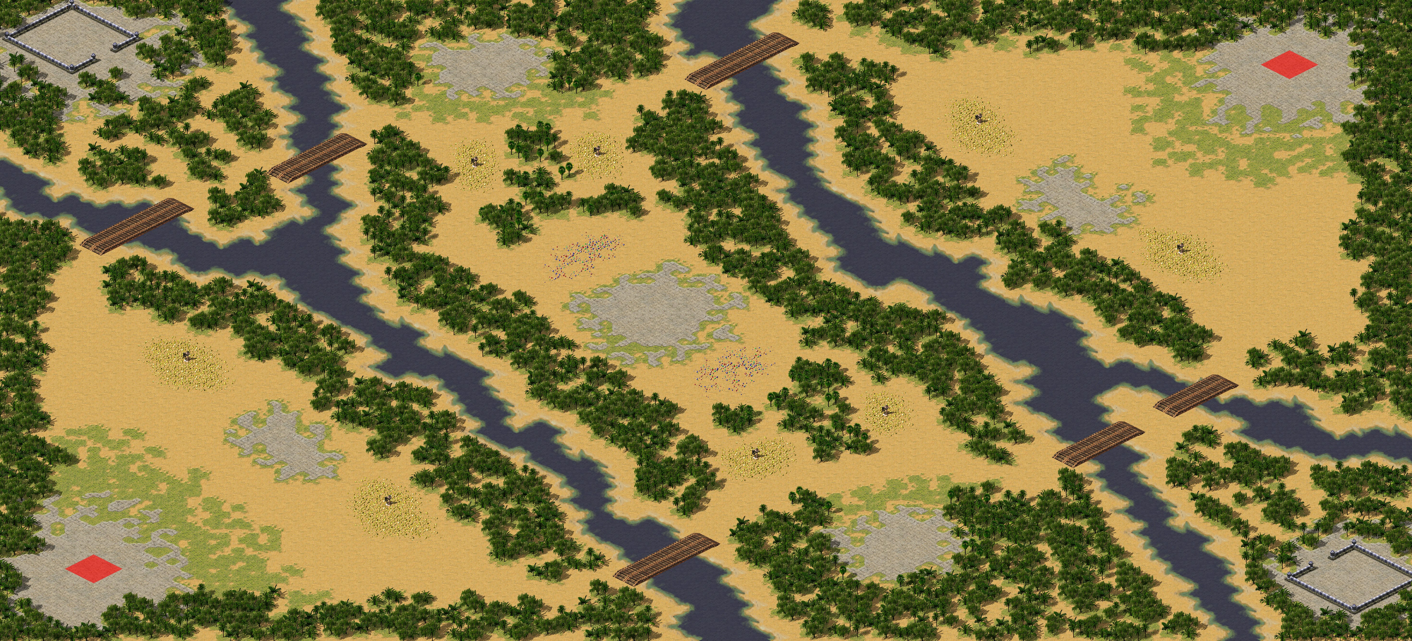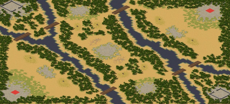 A good 1v1 map , excellent for tank battles and splitting. It has 1 oil derrick near each starting location and 1 oil derric on the opposite corner from the base in the middle bit of the map there are tech outposts near the top and the bottom and a tech airport in the middle. The airport has gems surrounding it and its holder could decide the winner of the game.