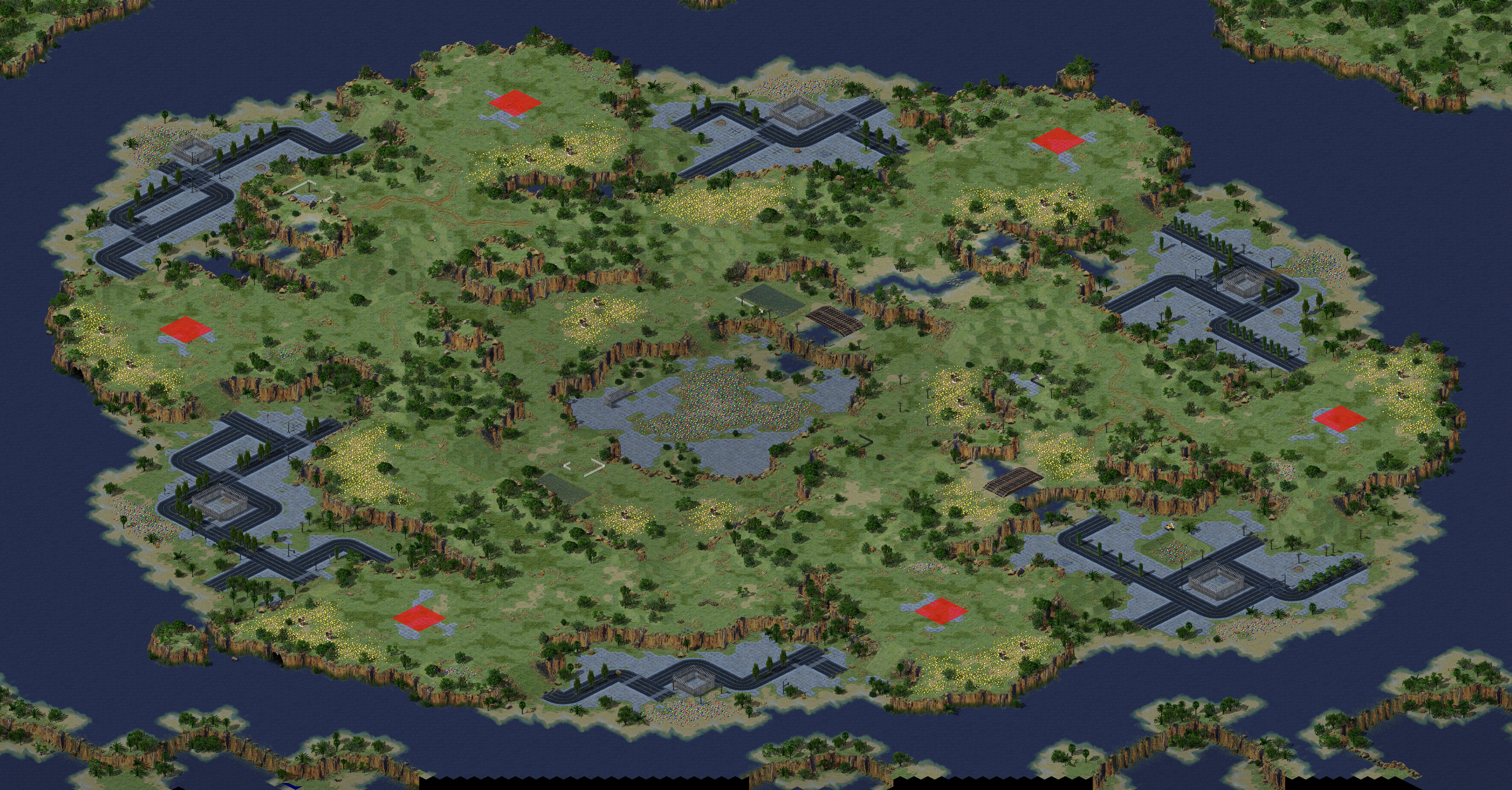 Comments: Superb map here! Very detailed with many civilian vehicles roaming around. It has good resource amounts, and lots of neutral buildings to occupy. If you could improve it, I'd say to give the players a better way to navigate to the enemy base, as there are a lot of impediments to pathfinding in the way. That and a bit more room to build a base would be good.
