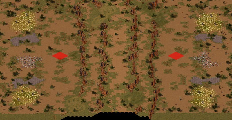 A small one-on-one map where the base areas are separated by higher ground. And it's the high ground that you want, too... don't let your opponent get it. You'll find some very special lighting on this map. All player-built structures emit light - a single structure emits negligible light but a fully-developed base can look pretty dramatic. Also - theatrical lightning effects added!